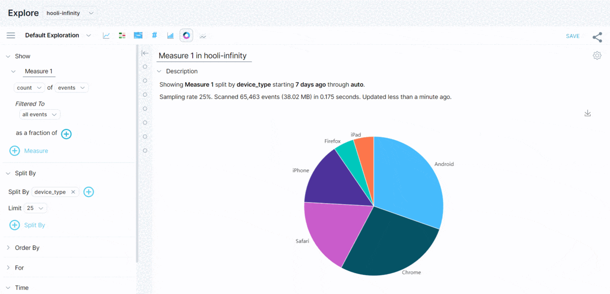Pie View is a type of view that presents grouped query results as sectors of a circle. Each sector of the circle represents the proportion of the total query results represented per group. Hovering over each provides further details, including the percent of the total query results.
