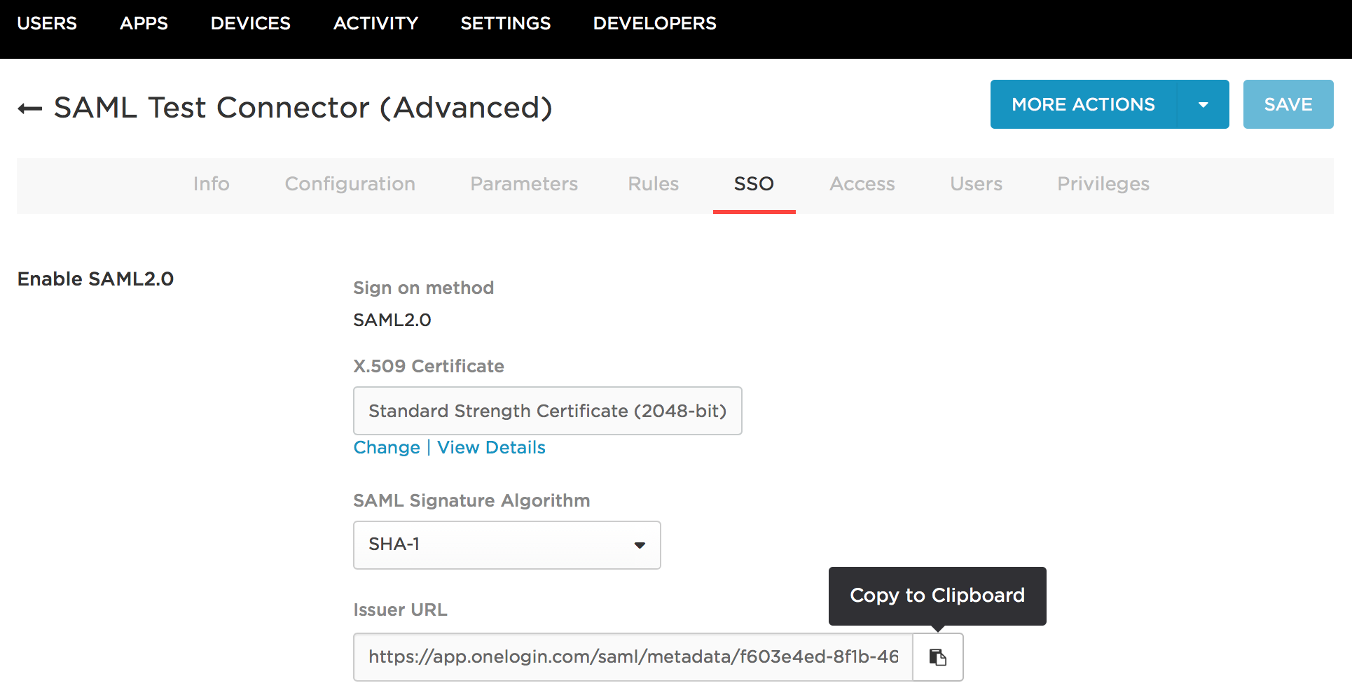 7. Click Save, then click on the SSO tab. Copy the Issuer URL and send it over to your Scuba team.